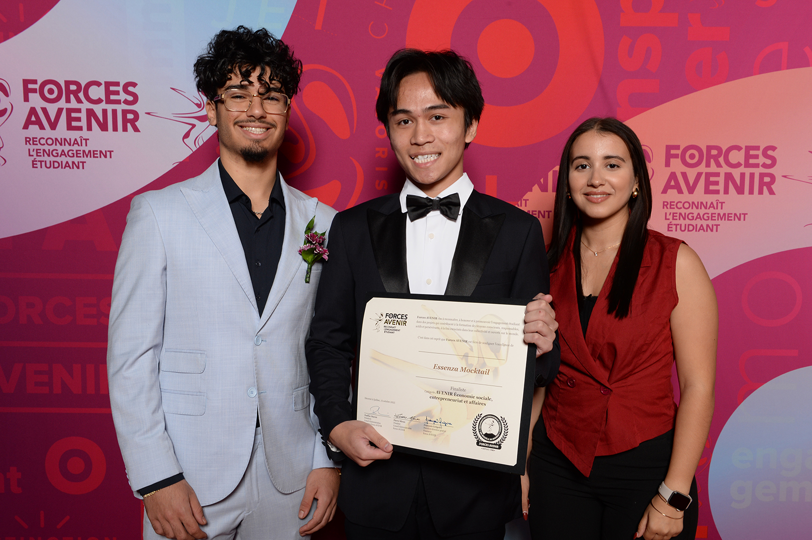 L’équipe qui a fondé Essenza Mocktail, pose fièrement avec leur prix lors du Gala Forces Avenir qui à eu lieu le 15 octobre dernier à Québec.