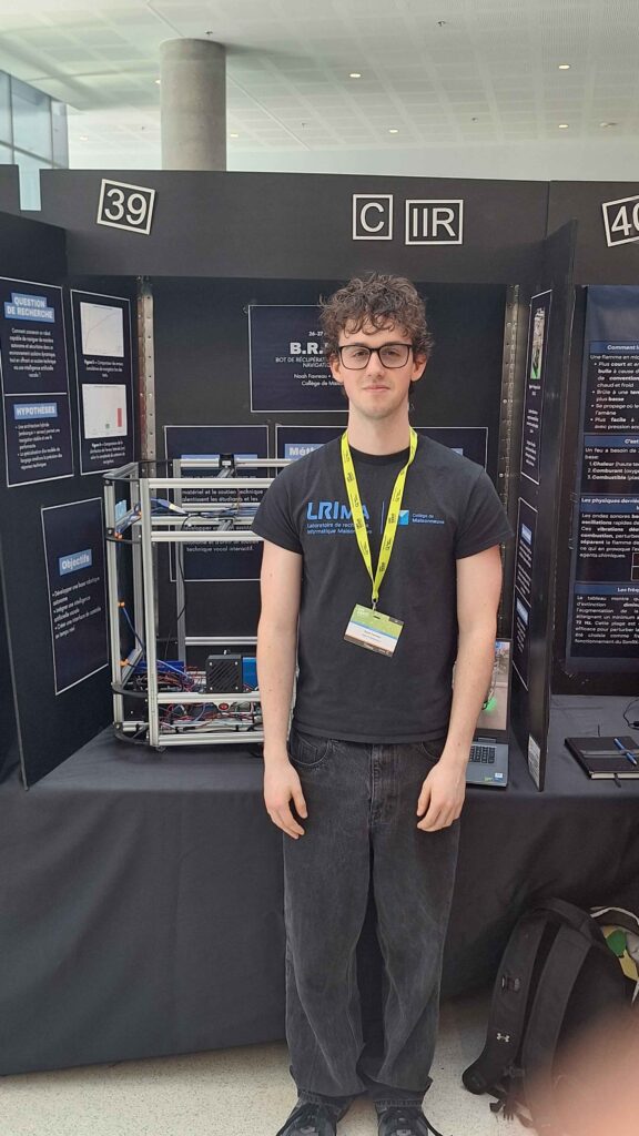 L’équipe du robot B.R.I.N.G. était représentée par Noah Favreau et Léo Lepage (Technologie du génie électrique, Électronique programmable). B.R.I.N.G. est un robot assistant conçu pour optimiser le soutien technique et jeter les bases d’une logistique automatisée au sein d’un laboratoire scolaire. Capable de naviguer de manière autonome d’un point A à un point B, il se déplace sur commande via une application dédiée. Équipé d’une intelligence artificielle spécialisée en objets connectés, il interagit par commande vocale pour offrir une aide technique quasi instantanée. Le système inclut une interface graphique permettant de suivre ses statistiques en temps réel et offre une flexibilité totale de contrôle : le robot peut opérer de façon autonome, semi-autonome ou manuelle selon les besoins de l’utilisateur.