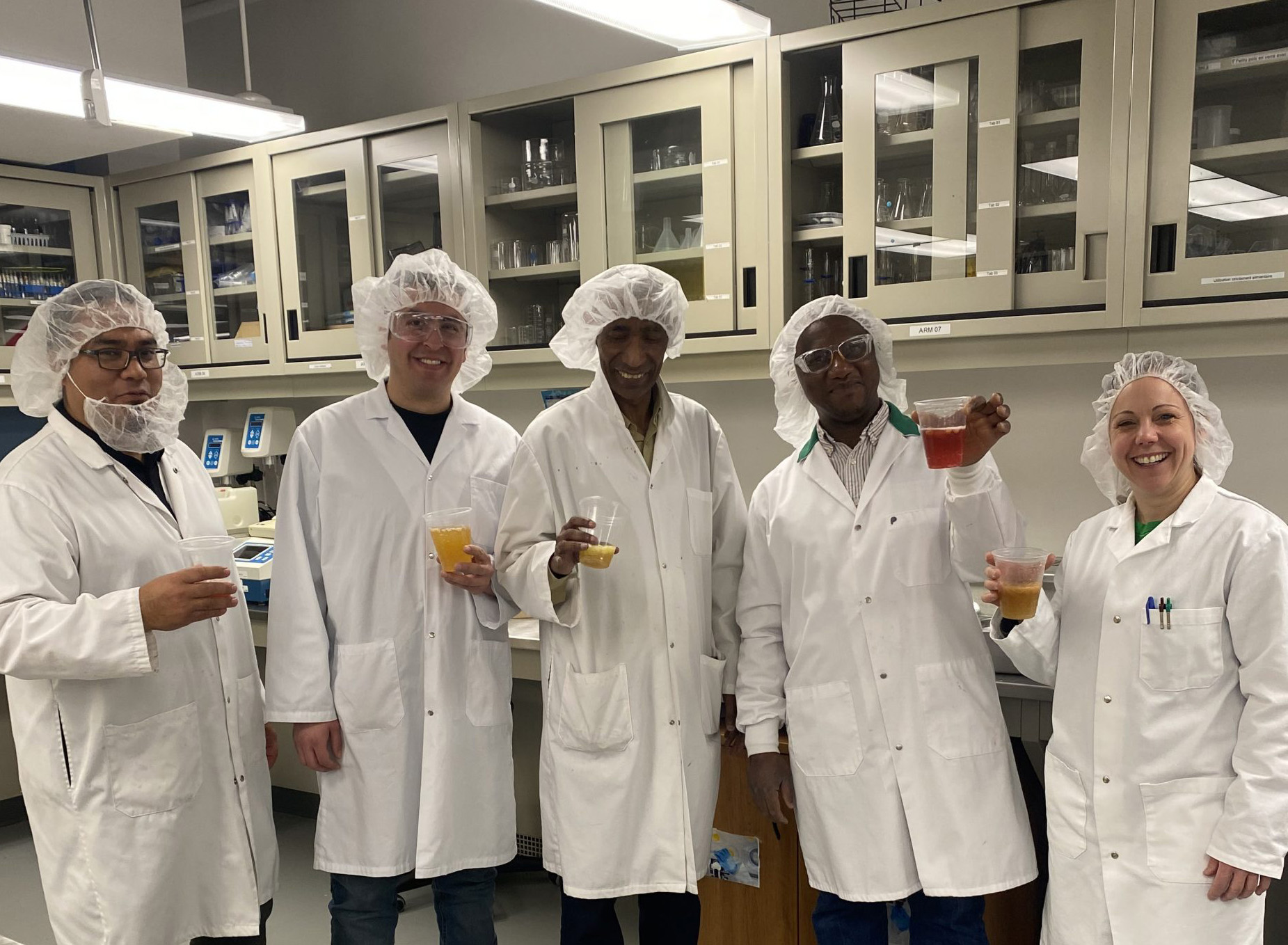 Cinq enseignants en enseignantes posant fièrement avec des verres de perles de thé qu'il ont concocté lors de l'atelier de Technologie des procédés et de la qualité des aliments